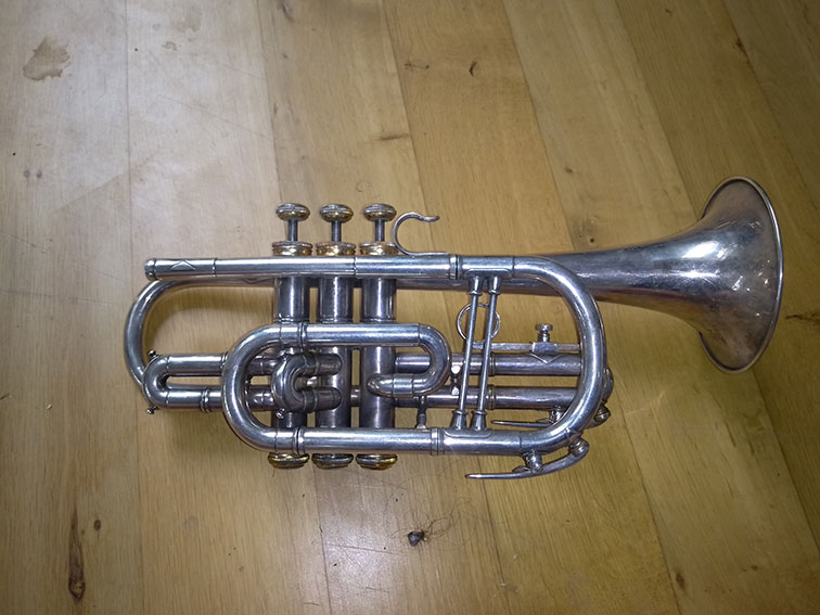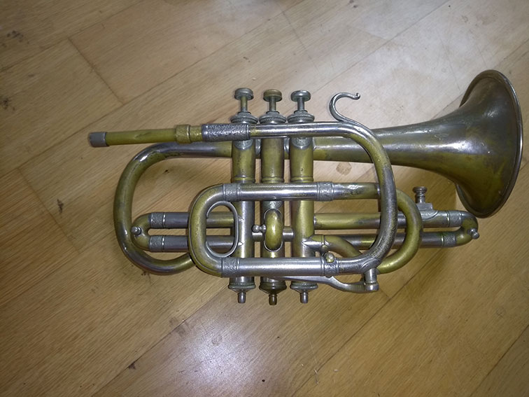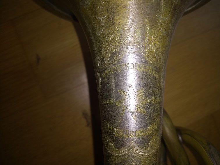 Ich möchte vor allem etwas über das Uralte Kornett erfahren. Es spielt immer noch gut und klingt sehr warm. Das Mundrohr hat mir Werner Christian Schmidt dachgebaut. Das Original fehlt. Alle Details am Instrument sind sehr schön verziert und Markneukirchen steht sogar drauf. Seriennummern an den Wunderlich Instrumenten habe ich nicht gefunden.