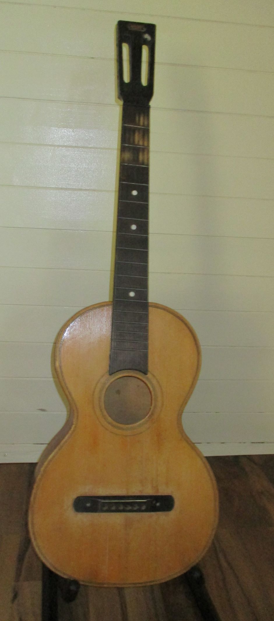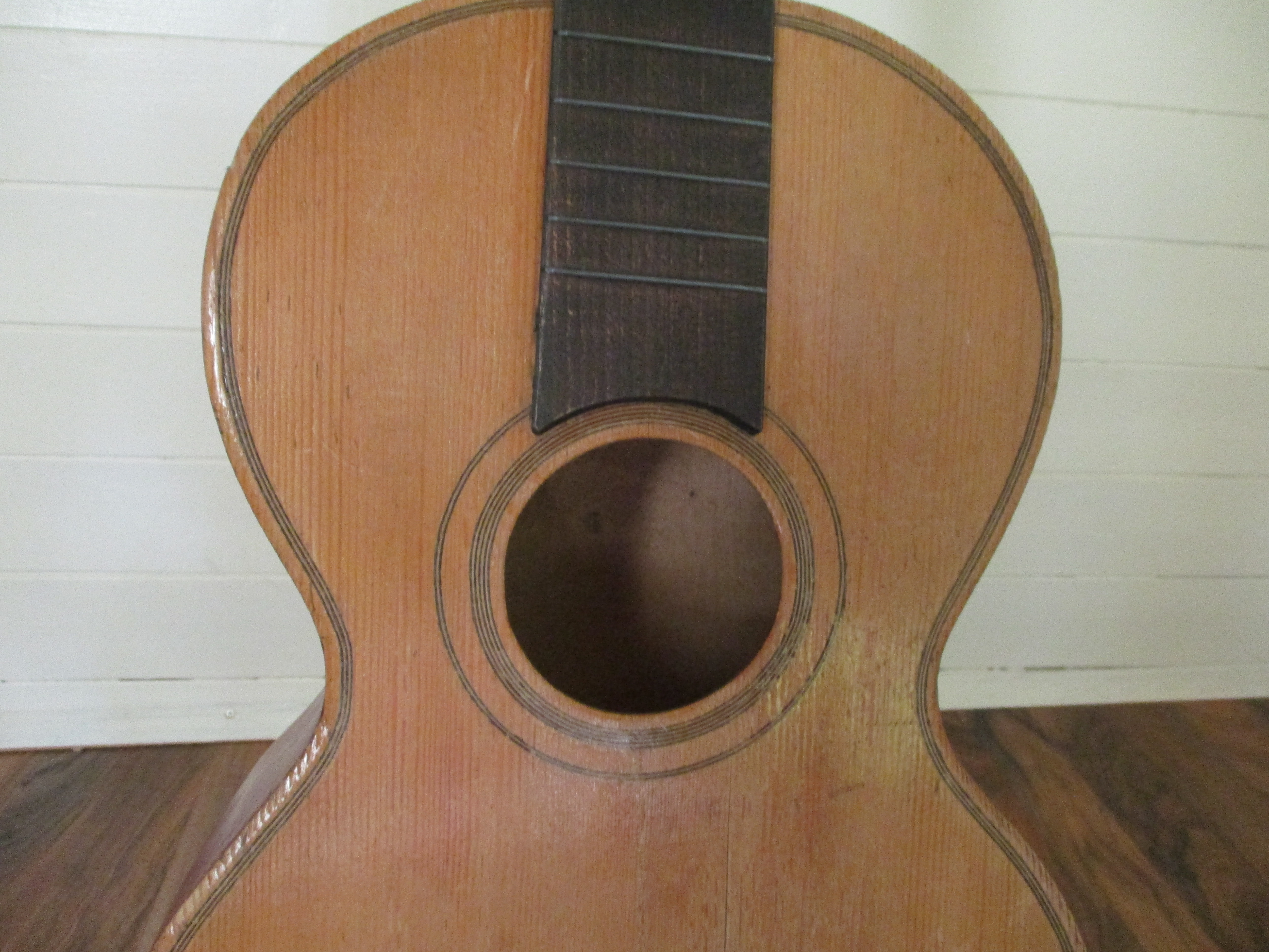 wir haben eine alte Gitarre erworben . Sie hat ein Schild , oben am Hals , mit der Aufschrift " Edmund Paulus Markneukirchen " . Die Gitarre ist ca. 90 cm lang .